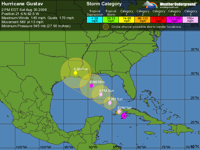 Nate's place is getting back to normal now. Carpet was re-installed today and people are coming to clean it tomorrow. He had the padding replaced and some baseboards. We have all been watching Gustav to see if it starts turning toward Florida at all.