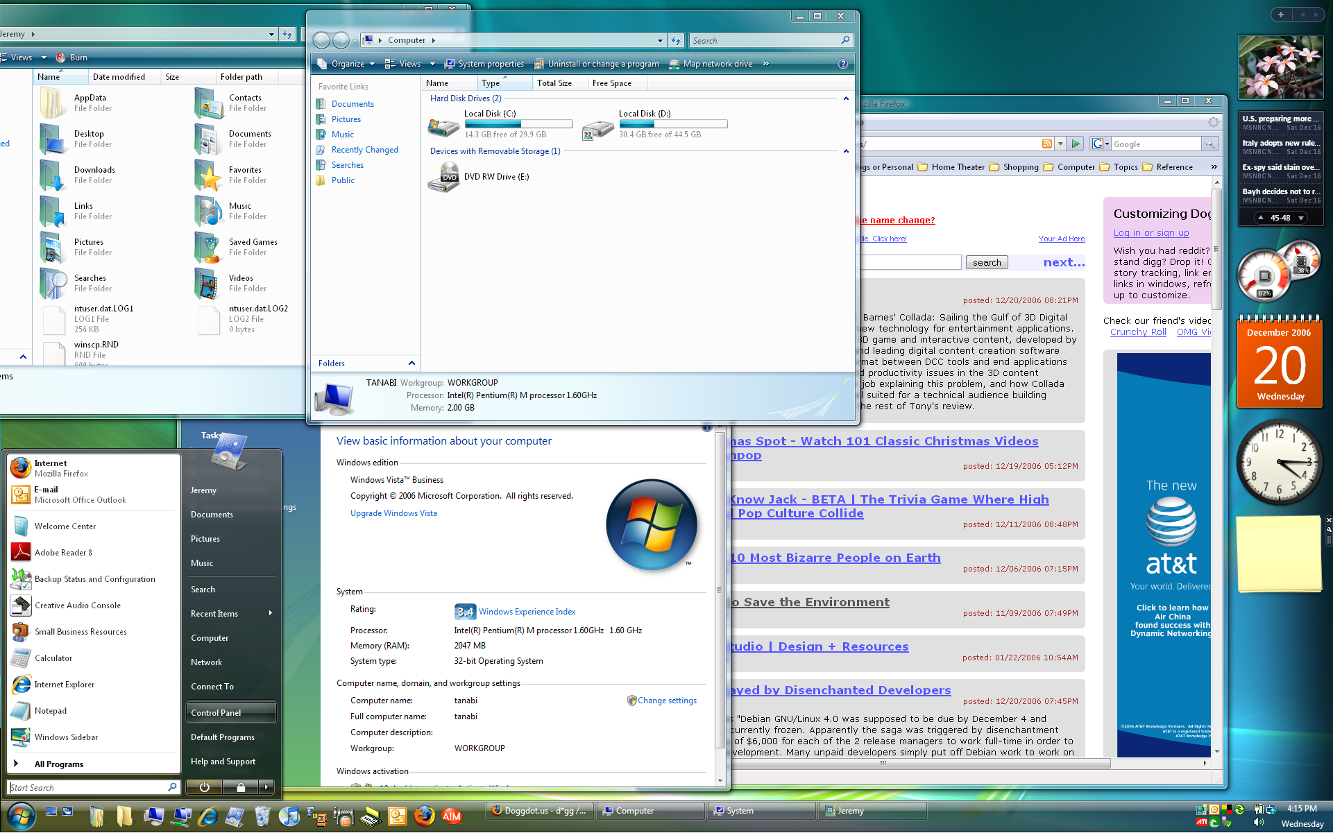 Well, I went ahead and put Vista on my laptop. Installation was painless, as was getting the couple of drivers installed, but I found the first "downgrade" from XP that is going to piss me off. For a couple years now, I've been customizing all of my Windows XP environments with the Desktop icons viewable as an auto-hide taskbar at the top of the screen. That way, I could hide the regular desktop icons and show off the nice Digital Blasphemy wallpaper.