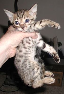 Although they look like exotics, these are a normal domestic breed called bengal cats. They are almost like dogs in several ways, namely they enjoy playing fetch, going for walks, and playing in water. Some of them also like to talk, chase flying objects, and can be clicker trained. I think some have a little hamster in them too.
