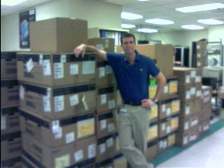 Today at work we received a huge delivery of servers. We thought it was pretty busy the past few weeks with the 16 Optiplex 745 systems arriving and the 5 PowerEdge 1950s. Well today we had 40 brand new (leased) machines sitting in the lab; the boxes took up a lot of space. It was a mixture of PowerEdge 1950/2950 and SunFire V245/X4100/X4200. This is such a big upgrade we are having to reevaluate the power delivery and air conditioning abilities of our current lab space; hopefully everything will operate fine. Nate had his camera phone with him so he got a picture: